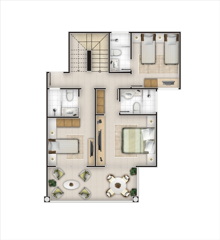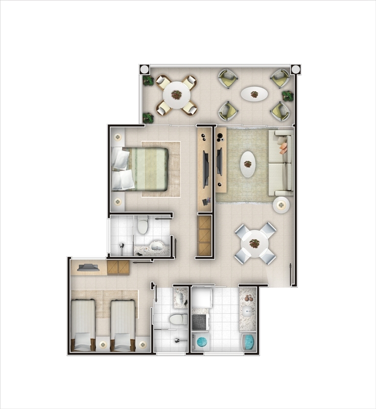 - Área Comum: Recepção, Bloco restaurante com bandeira própria, Piscina com raia e cascata, Hidromassagem, Bar tropical, Sauna integrada à piscina, Deck molhado, Piscina social, Piscina infantil, Quadra poliesportiva.