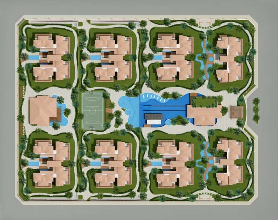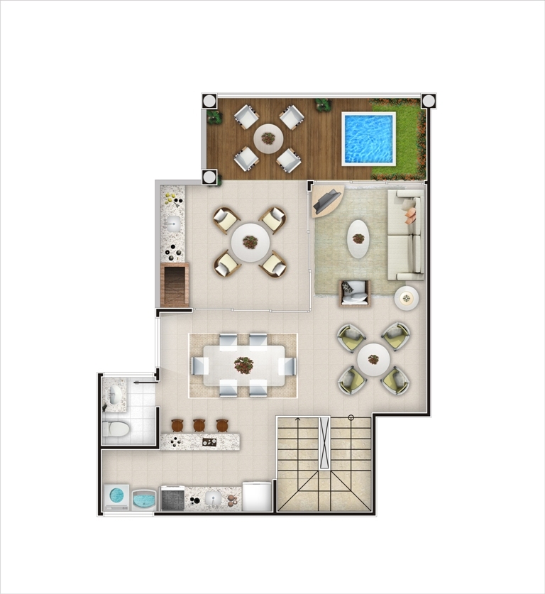 Recepção, Bloco restaurante, Lavanderia, Vestuário masculino e feminino, Refeitório, Administração, Pracinha de babás, Espelho d’água, Espaço relax, Pista de cooper, Piscina com raia e cascata, Hidromassagem, Bar tropical, Sauna integrada a piscina, Deck molhado, Piscina social, Piscina infantil, Quadra poliesportiva, Bar com espelho d’agua, Solarium, Fitness center, Kids Club, Salão de jogos.