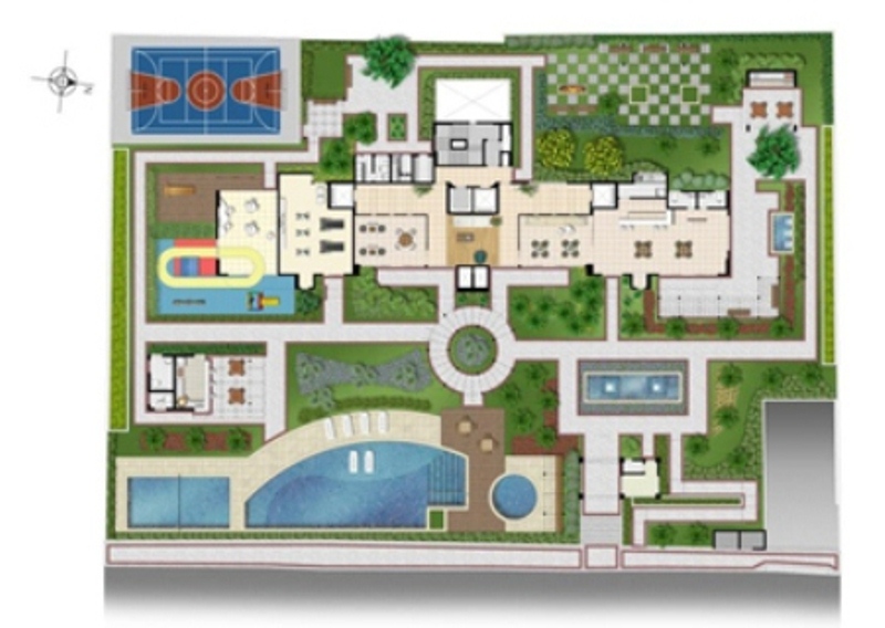 O pavimento Térreo, composto por jardins com tratamento paisagístico, praças, piscina e ambientes de lazer.