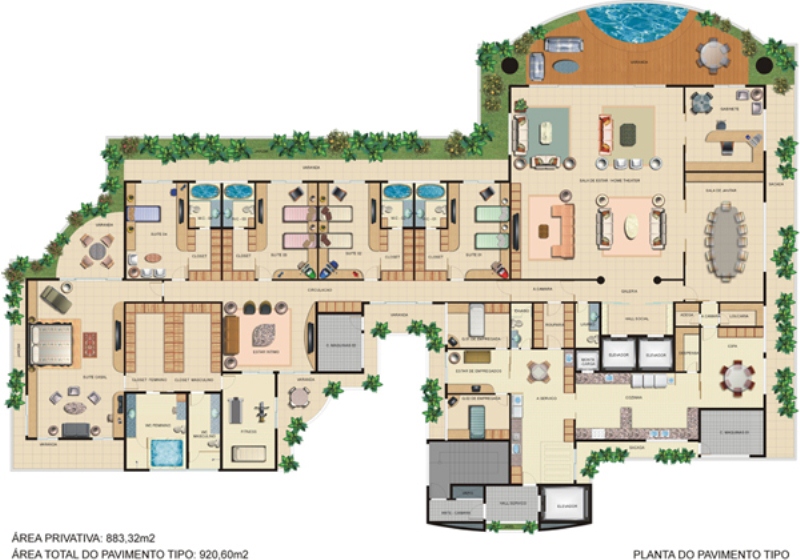 O empreendimento mais luxuoso de fortaleza com 12 vagas de garangem, condomínio com piscina adulta e infantil, espelhos de agua, heliporto, 15 vagas p/ visitantes, estar para motorista, pista cooper, quadra de tênis, fitness center, sauna e sala relax, salão de jogos e festa 2 elevadores sociais mais 1 serviço. 6000 m2 de área de lazer.