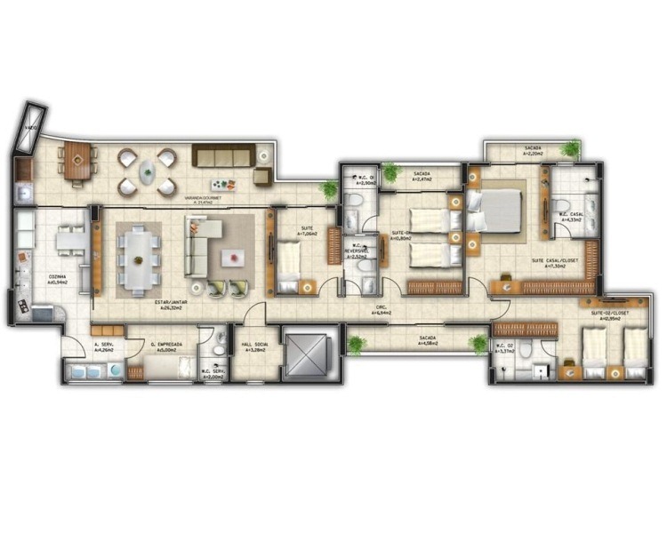 Apartamento de 170m², 3 suítes (sendo 01 máster), gabinete, WC reversível, sacadas, cozinha, área de serviço, quarto de empregada.