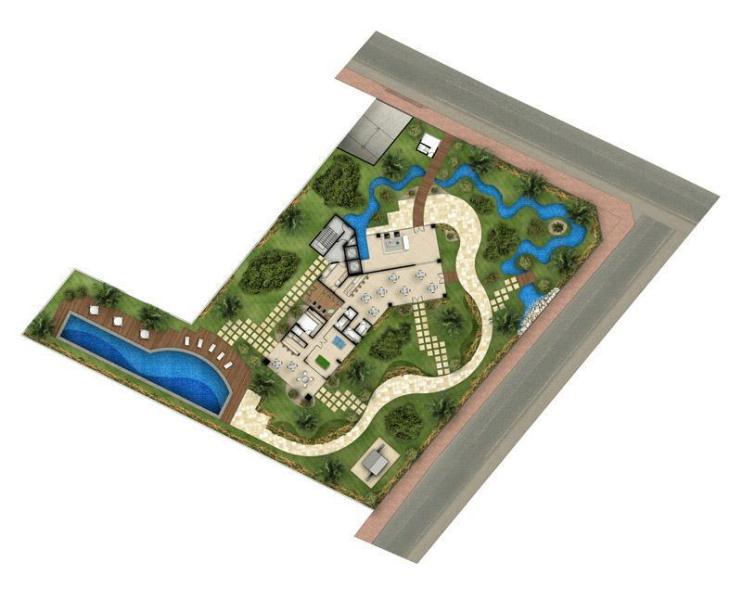ÁREA COMUM - Terreno Norte / Nascente - Piscina com Raia de 25 m - Deck com Churrasqueira - Espelhos d`água com cascata - Fitness Center - Sauna cm Relax - piscina coberta - Salão de Jogos - Salão de Festas com Bar.