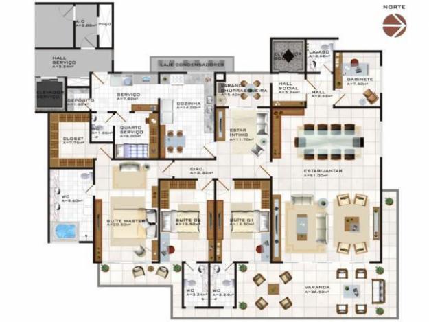02 (dois) apartamentos tipo com 240m² constituídos de hall, lavabo, gabinete, sala de estar/jantar, varanda, suíte 01, wc suíte 01, suíte 02, wc suíte 02, suíte master, closet suíte master, wc suíte master, estar íntimo, varanda churrasqueira, cozinha, área de serviço, quarto de serviço, wc serviço e depósito.